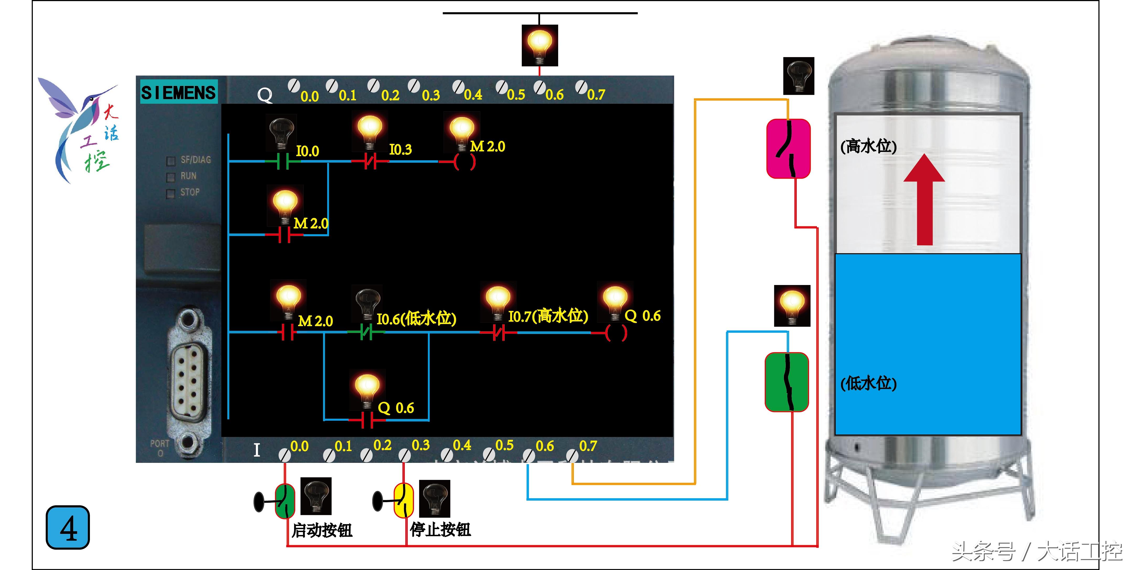 图4 ,这时我们看到水位已经到了水罐的中部,这时低水位开关已经闭合,常开触点I0.6断开,但线圈Q0.6依然接通,这因为常开触点Q0.6早已经形成了自锁。所以Q0.6依然有输出,水泵还是继续补水运行。