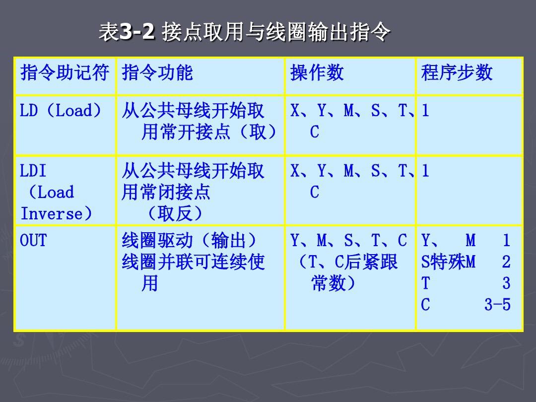 早期,在编程软件普及前一般都是先用梯形图设计程序,然后再手工编译成指令表程序,最后用手持编程器将程序送入PLC。现在,编程软件已经普及,在编程软件上,我们只要编好梯形图程序,软件会自动编译成指令表程序。所以,我们今后重点是梯形图编程语言的学习和编程软件的操作。对指令表编程语言则不作进一步讲解。但是,PLC的各种操作指令的学习则是必不可少的编程基础。