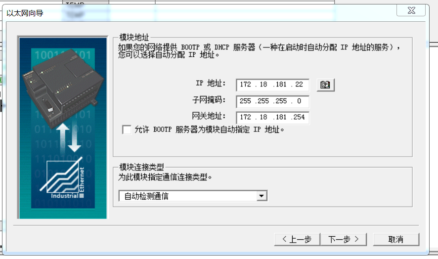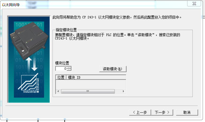 然后点击确认,进行以太网向导,通过编程线与PLC连接,通过读取模块能够自动识别模块安装位置,在CPU后一般默认为零,然后点击下一步对模块型号进行确认,如下面两图所示。