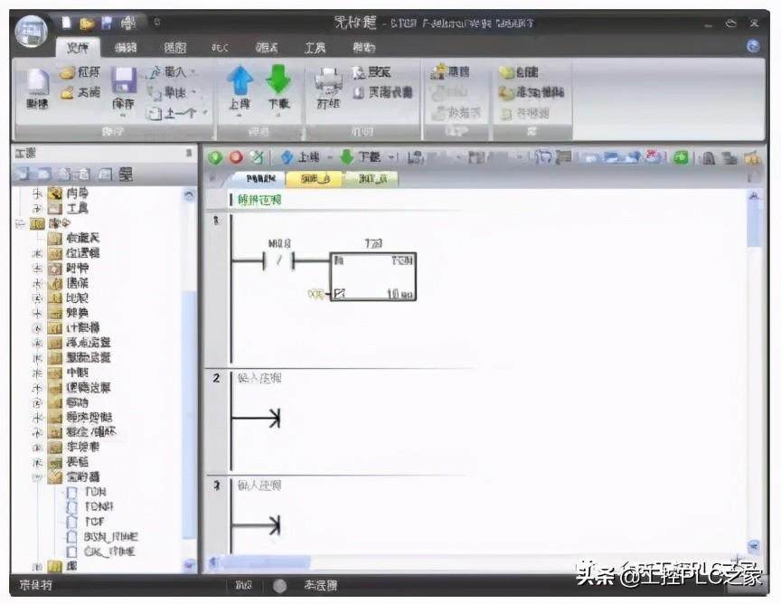 与 CPU 建立通信之后,即可创建和下载示例程序。要下载所有项目组件在“文件”(File) 或PLC 菜单功能区的“传输”(Transfer) 区域单击“下载”(Download)