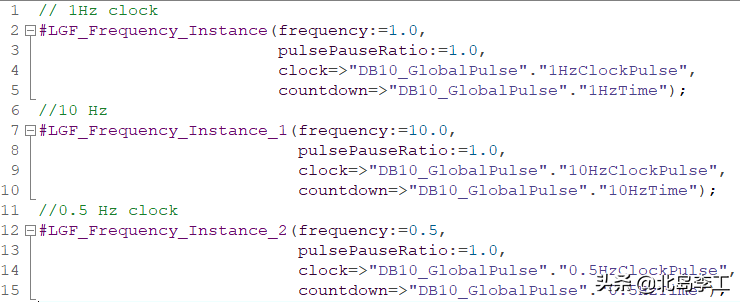 下面的代码(FB2_ClockTest)分别产生一个1Hz、10Hz、0.5Hz且占空比为1:1的脉冲信号。