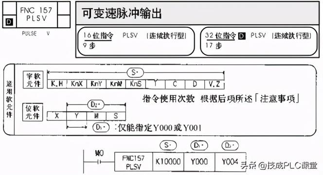 几个脉冲输出指令中最简单的就是PLSY,其编程手册截图如下图22-3所示。PLSY指令可用于16位,也可用于32位,具体可根据脉冲数进行选择。这里要注意的是,该指令没有脉冲执行型。