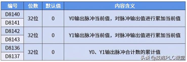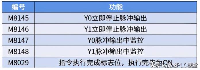 其中M8147、M8148为脉冲输出监控,若Y0或Y1有脉冲输出,对应辅助继电器将为ON。而M8145、M8146为脉冲输出停止,如果指令的驱动条件不能断开,就可以通过M8145、M8146来停止Y0或Y1的脉冲输出。M8029就不用我多说了,表格已经写明。