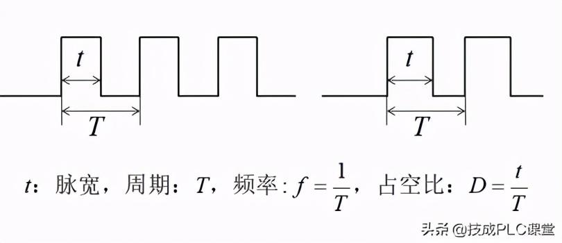 如下图22-1所示为脉冲输出信号的波形及相关变量。脉冲输出是一个连续的周期性信号,其中t为每个脉冲导通时间,即脉冲宽度;T为脉冲周期;频率f为周期的倒数,含义是每秒产生的脉冲个数,所以1/T中的分子1其实是指1秒钟,而1/T就是指1秒含有多少个周期;占空比是指脉宽占周期的比例。