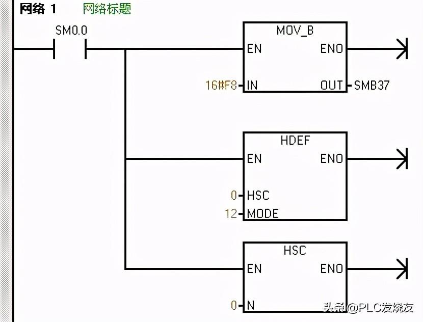 以上的程序,在主程序的网络一中,首先用SM0.1首次扫描驱动高速计数器子程序进行高速计数初始化,同时对Q0.0的过程映像区清零。在高速计数器子程序中,首先传送16#F8到SMB47定义控制字节定义为更新当前值加计数,然后执行HEDF指令定义高速计数模式12和选择高速计数器0,最后是激活高速计数器,执行HSC指令。