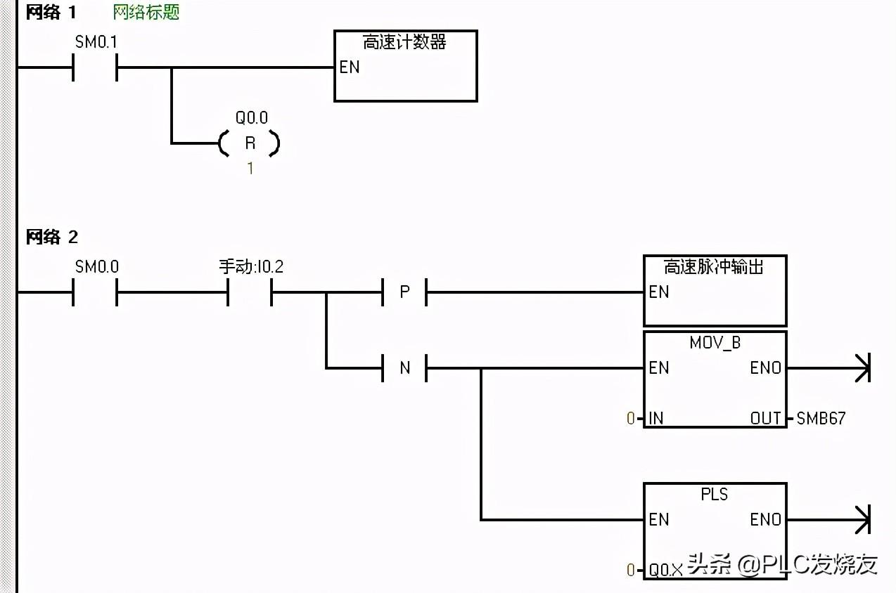 在主程序的网络二中,用I0.2的上升沿才驱动高速脉冲输出子程序,用I0.2的下降沿来驱动一个传送指令,传送0到SMB67,并同时驱动一个PLS指令。在高速脉冲输出子程序中,首先传送16#85到SMB67中定义控制字节,这里选择的是PTO模式、单段、1us/周期、装入周期和脉冲数的情况(控制字节的定义可以参考PTO/PWM控制字节表),并传送100到SMW68中写入周期值,传送100到SMD72中写入脉冲数,最后执行PLS指令。