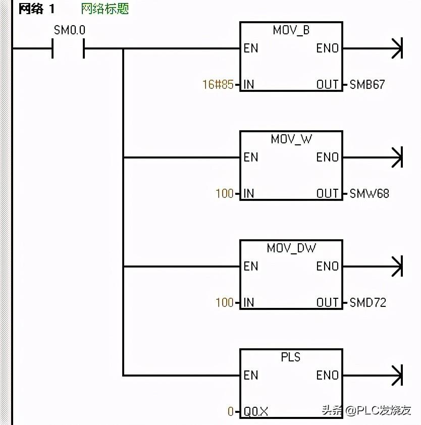 我们要注意的是,我们在使用PLS指令时一般是有步骤的。第一步,我们在使能PTO/PWM之前,要对Q0.0、Q0.1的过程映像区清零;第二步,定义控制字节,Q0.0对应SMB67,Q0.1对应SMB77。第三步,写入PTO/PWM相关寄存器的数据,比如SMW68对应的是PTO/PWM周期值(2-65525ms),SMD72对应的是PTO脉冲计数值。第四步,就是连接中断事件和中断程序,并允许中断这步是根据实际情况决定要还是不要的;第五步,执行PLS指令,激活某个脉冲输出,更新控制字节。