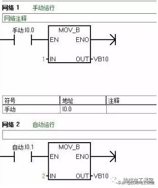 11、PLC和上位机(或触摸屏)组成监控系统时,在画面上很多时候需要有“手动”、“自动”等控制模式。在程序里面可以用“MOV”指令。如:当选择“手动”就将常数1 MOV到一个寄存器VB10里面,当选择“自动”就将2 MOV到同一寄存器VB10。只要判断寄存器的数据是多少,就知道系统是那种控制方式。这样的思路好处是容易理解,不需要互锁之类的程序。
