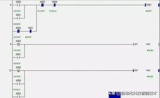 12、在顺序控制程序时,即一个动作完成后,进入到下一个动作,等类似的顺序控制,采用+10控制模式,。其思路是:预置一个寄存器,在初始化时值为0,当系统启动后,对它+10,此时寄存器为10,寄存器等于10时可以做第一个动作;第一个动作完成后,再对寄存器+10,此时寄存器等于20,可以做第二个动作,这样只要判断寄存器里面数据为多少,就知道要完成那个动作。当需要跳跃动作时,可以不再+10,可以加+20\+30....,看实际的需要而定。为什么加10而不是加1,因为加10之后,如果插入一段,只要在这10个空余的地方随便选择一个位置就可以了。
