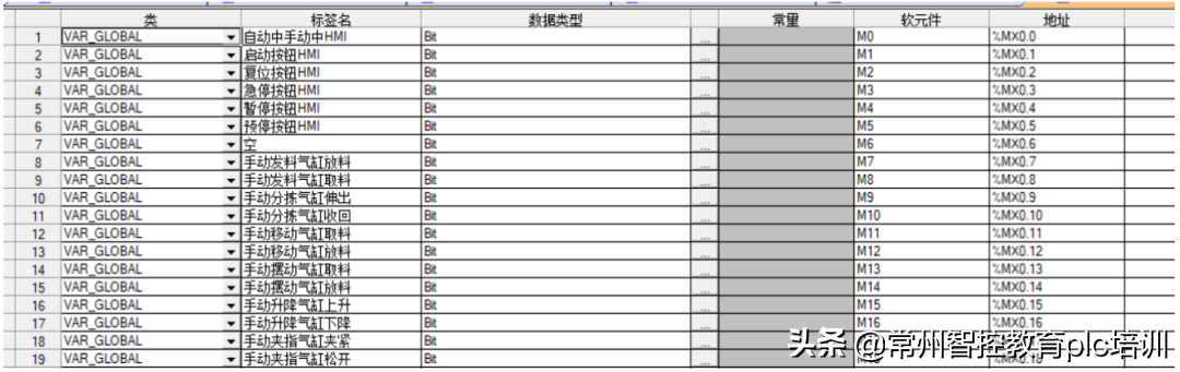 注意:这些“0/1标志位”的建立,是为了ST语言程序在设备动作中,存储设备的动作完成信号、物料判别信号、系统中断信号、下一步动作许可信号等程序数据。