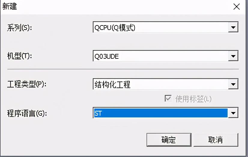 2:点击左上角白色图标新建,或者点击工程下拉菜单有个新建,如下图,选择我刚项目结束的一个Q系列,选择结构化编程,语言选择ST;