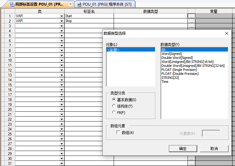 6:这个时候双击局部变量,新建变量,今天主要演示一个简单的起保停的操作,新建start,stop,数据类型选择Bit,z这个Bit也就是位,相当于我们的之前使用的M0,M1,