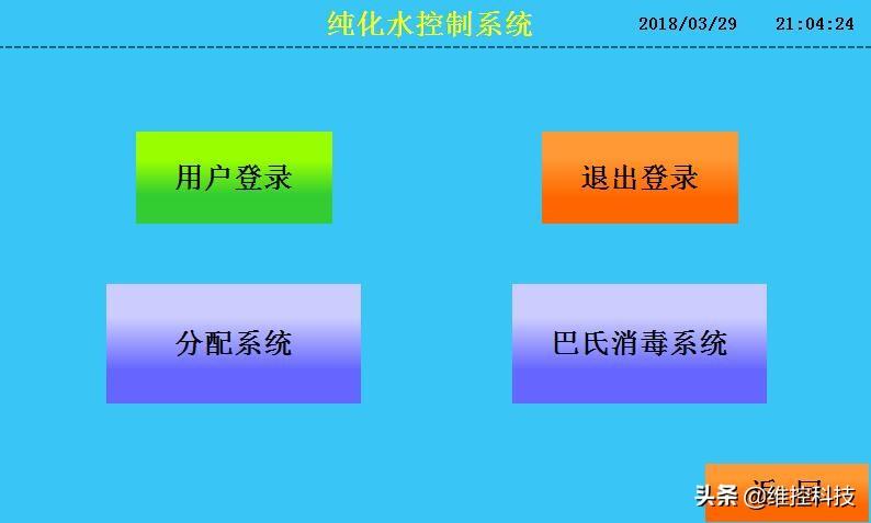 1、主菜单画面: 此画面为菜单画面,拥有用户登录功能,分级控制,操作员和工艺员有不同的操作权限。分配系统和巴氏消毒系统两个系统独立工作。