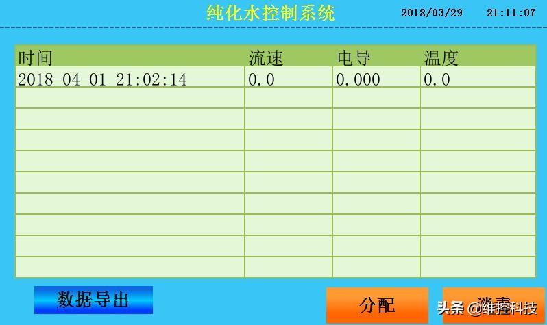 5、数据记录画面: 此画面主要是对系统的流速、电导、温度进行记录,可通过优盘导出数据。