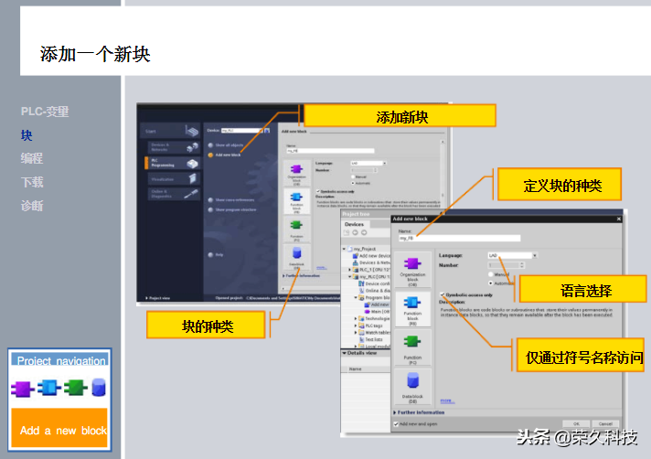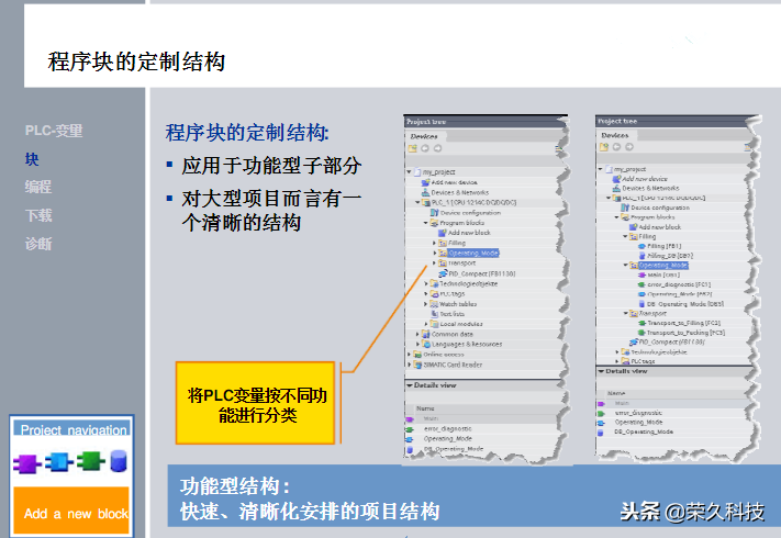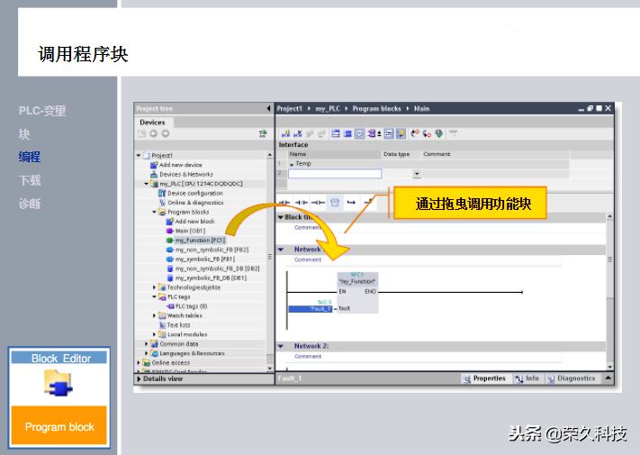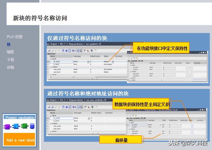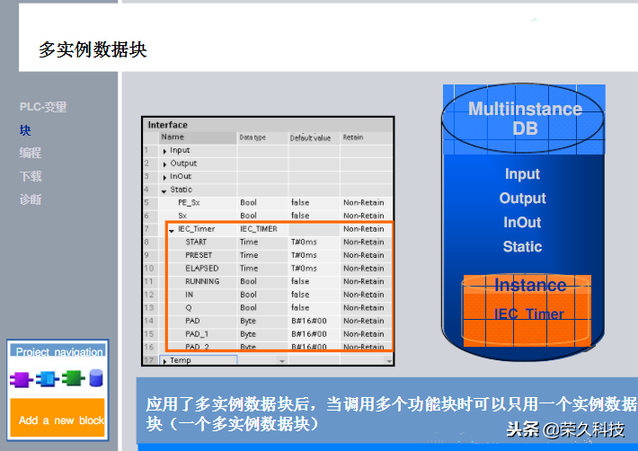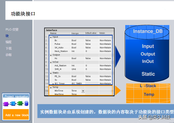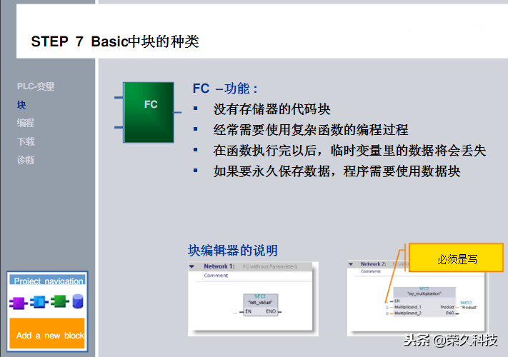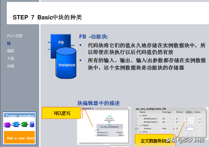 功能块 FB(function block ):子函数,内部含有静态变量,须附加背景数据块 DB,多数情况下需要多个扫描周期内执行完毕。