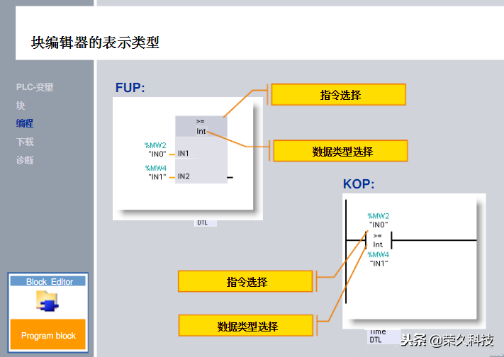 功能块图( function block diagram, FBD):类似于输电的图形逻辑符号,用类似与或非门表示逻辑运算关系。