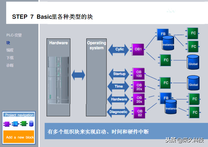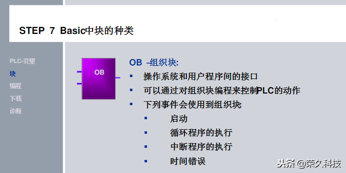 组织块 OB(organization block ):由操作系统调用, OB 间不可互相调用。 OB 可调用子函数如 FB/FC 。有程序循环组织块 (扫描循环执行) 、启动组织块 (startup ,启动时执行一次,默认编号 100 )、中断组织块 。