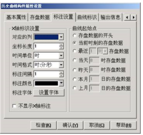 标注设置页: 在此页中,可以对历史趋势曲线的X坐标(时间轴)进行组态设置。在曲线起始点选项框中,可以根据需要确定曲线显示的起始时间和位置。