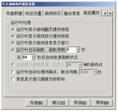高级属性页: 在高级属性中的设置主要是对历史曲线在运行的各种属性进行组态设置。在高级属性页中,可以选择的组态项目有: