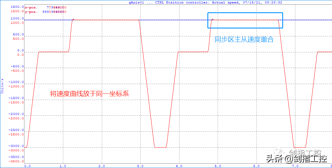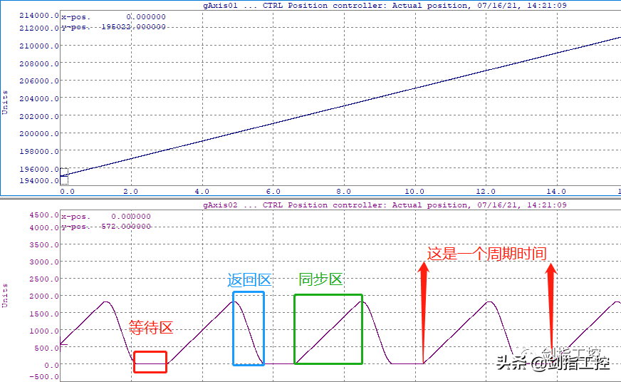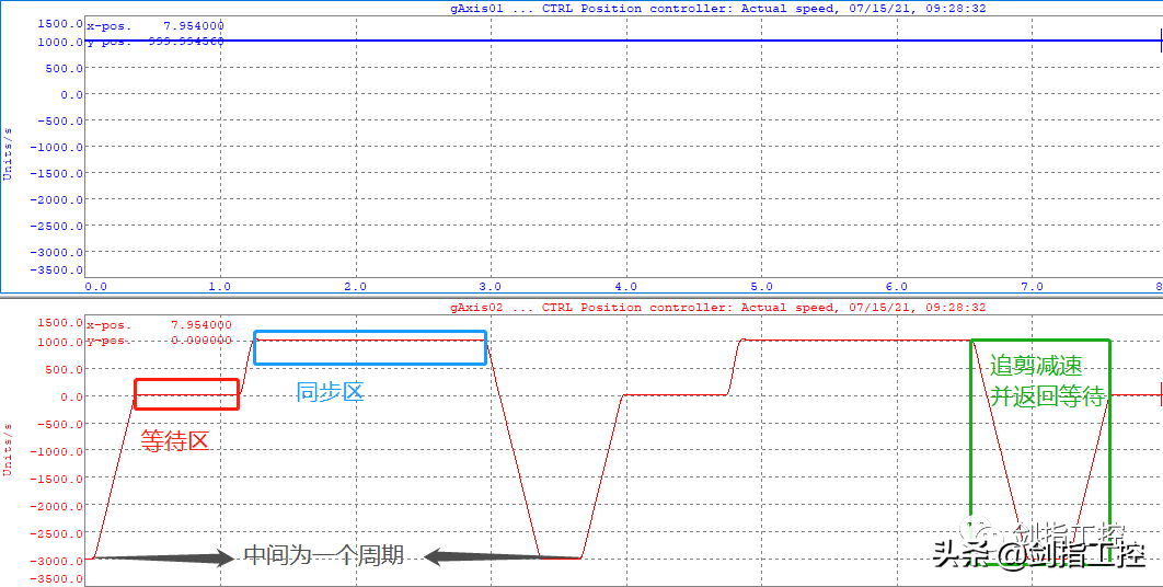 分析以上位置曲线和速度曲线可以发现无论主轴还是从轴位置和速度都很平滑,这对机械的运行的稳定性及其重要,并且从轴跟随的效果也非常好,从同步区的速度可以看到从轴的速度和主轴完全一致,这样才能够保证切割时产品边缘是笔直的直线而不是一条斜线或者波浪线。边缘如果是斜线说明从轴速度一直偏大或者偏小,边缘是波浪线说明从轴的速度忽快忽慢,这两种现象在我们的应用中都没有发生。