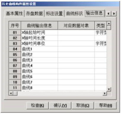 输出信息页: 输出信息页组态了历史曲线操作过程中产生的一些信息的输出办法。通过在对应的项目上连接数据对象,可以在数据对象中,实时的获取历史趋势曲线产生的值。在输出属性页中,可以组态的项目有: