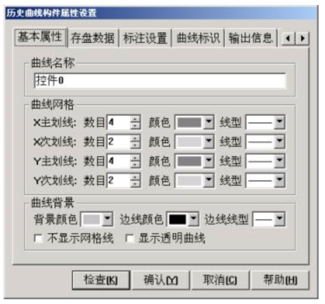 基本属性页 :设置历史曲线的名称及网格、显示与否、密度以及历史曲线背景颜色和边线的颜色线形。如图,可以组态的项目包括: