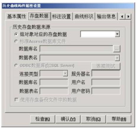 存盘数据页: 在这个选项中,组态历史趋势曲线的数据源,数据源只可以选择使用MCGS的存盘组对象产生的数据。不可以选择Access数据库和ODBC数据库中产生的数据。