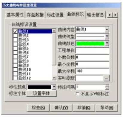 曲线标识页: 在MCGS嵌入版组态软件的历史曲线中,能进行总共16条曲线的组态。同时显示16条曲线,会导致曲线显示过密,无法查看。因此,一般只同时显示1~4条曲线。但是,通过在脚本程序中调用历史曲线方法,用户可以在运行时决定显示哪条曲线,以方便进行16条曲线之间的比较。在曲线标识页中,左上部分是曲线列表,曲线列表中,要使用一条曲线,必须在这条曲线左边的复选框中给这条曲线打勾,此时,右上部分曲线组态项目就可以使用了。通过曲线组态项的组态,可以使得这条曲线以合适的方式显示出来。为了组态其曲线,可以在曲线列表中选择其曲线,此时,正在组态的曲线信息将被保存,而选中曲线的信息将被装载到曲线组态项目的各个组态项中。曲线的组态项包括: