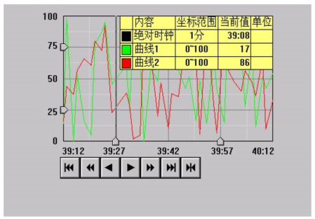 l 最小值、最大值:设定了曲线的最小最大值。同时,Y轴标注的绘制,也由这个组态项目决定。当使用多条曲线时,MCGS嵌入版使用第一条曲线的最大最小值来进行Y轴的标注。Y轴以第一条曲线的最小值作为Y坐标原点起始值,以第一条曲线的最大值作为Y坐标最大值。最小值可以大于最大值,此时Y轴方向是数值减少的方向。使用多条曲线时,每条曲线都按照自己的最大值和最小值的组态映射到整个Y轴坐标上。因此多条曲线可以使用不同的比例结合到同一个趋势曲线中显示。