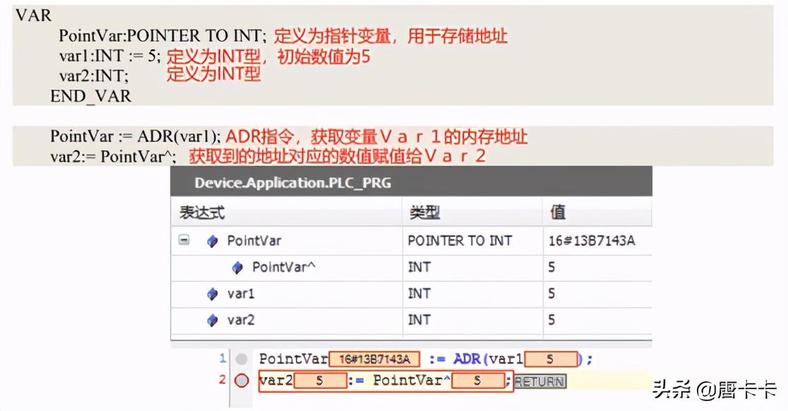了解了数据怎么在PLC中保存和读取后,结合一个变量的地址称为该变量的“指针”。那么上例中地址1000和1001就是变量Var的指针。