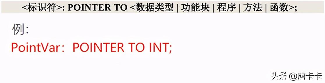 在 CoDeSys 使用关键字“POINT TO+类型”对指针变量进行声明。类型可以为变量、程序、功能块、方法和函数的内存地址。它可以指向上述的任何一个对象以及任意数据类型,包括用户定义数据类型。