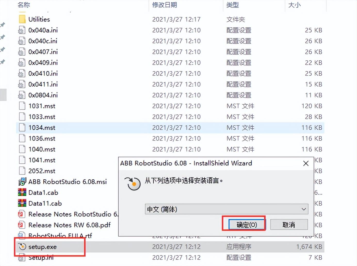 ABB官网上提供RobotStudio软件的试用版,可以直接在官网上下载。下载完成后,解压,进入解压文件夹,找到setup.exe,双击进行安装,选择安装语言,这里我们选...A...