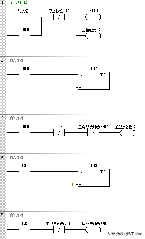 星三角降压启动控制是异步电动机启动控制中的典型控制环节,是常用的小型控制系统,在PLC控制中可以利用定时器实现星型到三角形的转换。假设控制中有启动按钮、停止按钮,还有主接触器、星型接触器和三角形接触器,将这些元器件连接好如下编写程序即可实现星三角降压启动控制。