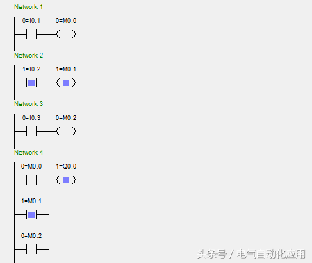 程序第一行叫线圈输出指令,第二行叫置位指令,第三行叫复位指令。