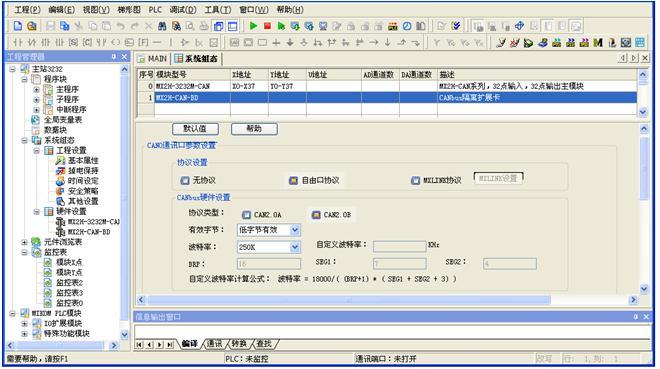 在系统中,PLC通过CAN总线通讯。CAN总线是一种支持分布式实时控制系统的串行通信局域网络总线。具有无主从特性,总线自带仲裁系统,任何一站有事件发生都可以立即上传,采用CAN总线系统构建的控制系统具有极快的响应速度,实时性极好,抗干扰特性好,节点数众多,接线简单,非常适合印刷机系统输入输出应用。与RS485通讯相比有极大的优势。为了增强保密性,采用麦科PLC的CAN自由口协议定制独有的CAN软件通讯协议和波特率,在不知波特率和通讯协议的情况下无法仿制。CAN自由口设置画面如下图所示: