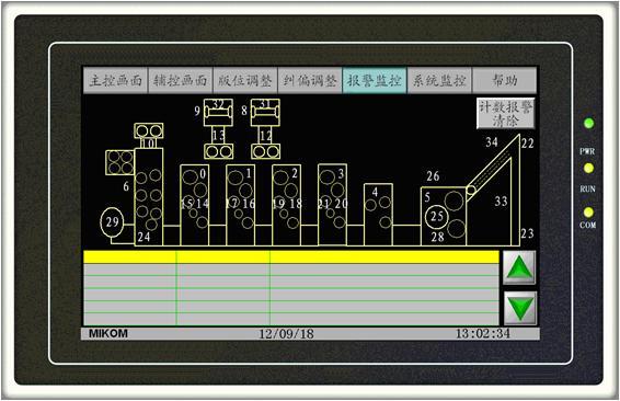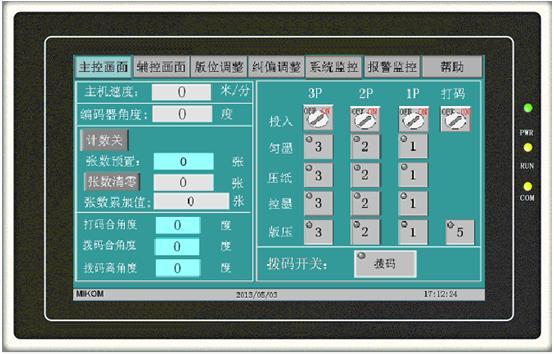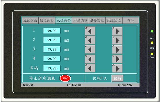 人机界面主要包括主控画面、轴控画面、版位调整、纠偏调整、系统监控和报警监控画面等。