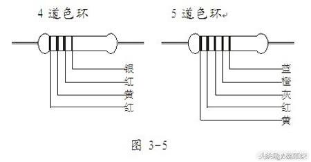 如图3-5所示,如某电阻有4道色环,它表示2.4KΩ,误差等级为±10%;如某电阻有5道色环,它表示428KΩ,误差等级为±0.2%。