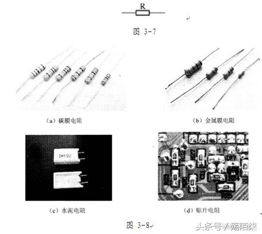 顾名思义,固定电阻的阻值是不可变的。它又根据材料的不同可分为碳膜电阻、金属膜电阻、合成膜电阻,线绕电阻等。其中常用的是碳膜电阻和金属膜电阻。固定电阻在电路中通常用字母"R"表示,其电路表示符号如图3-7所示,它的外形如图3-8所示。