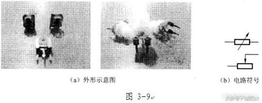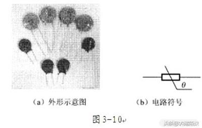 c、热敏电阻:热敏电阻就是在不同温度下阻值会变化的电阻。热敏电阻有正温度系数和负温度系数两种。所谓的正温度系数热敏电阻就是它的阻值随温度升高而增大,负温度系数热敏电阻的阻值随温度升高而减小。热敏电阻的外形如图3-10所示
