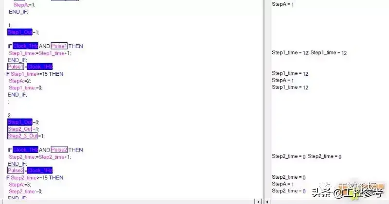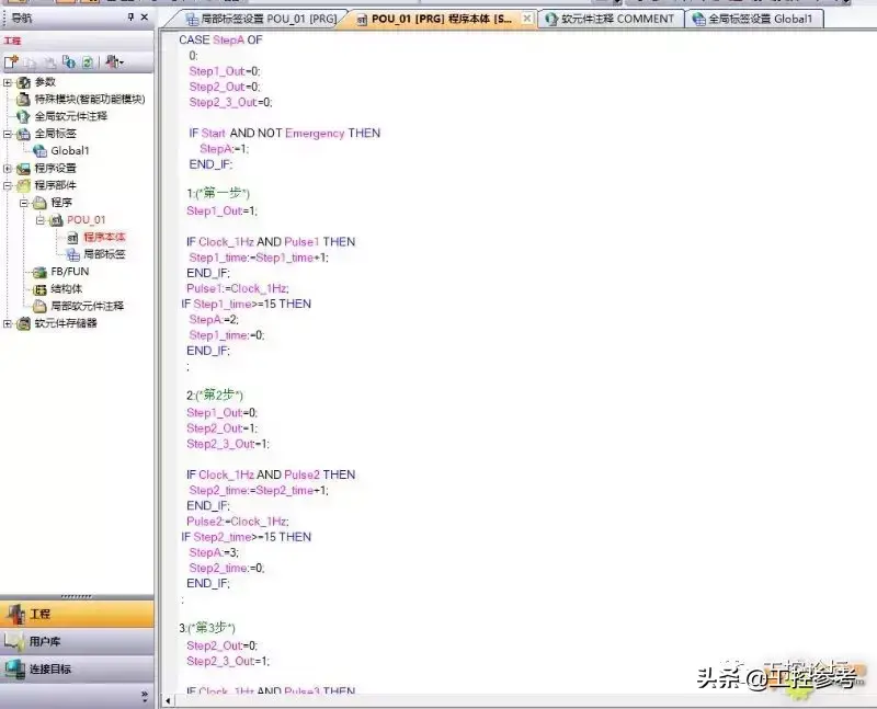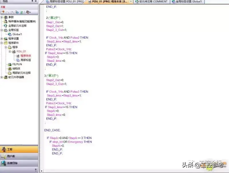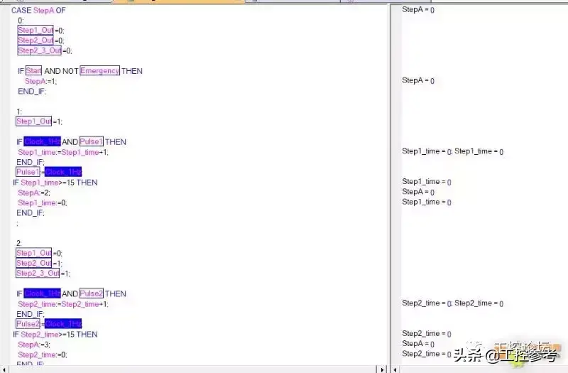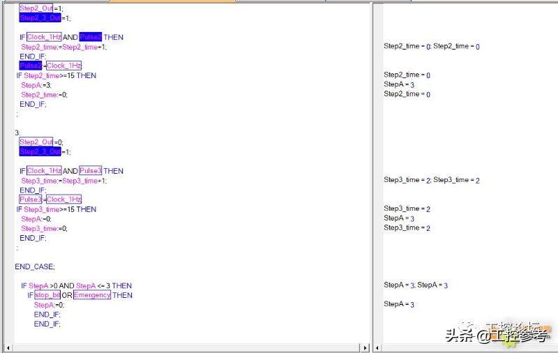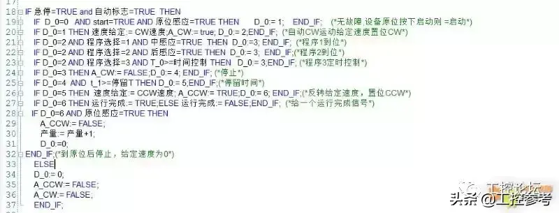 所以很多人说什么ST语言只适用于计算,不适用于逻辑控制什么的,我就呵呵了。ST语言也一样适用于逻辑控制,只是看各位编程人员擅长于使用哪种编程语言了。下面再贴出上述编程方式的ST语言下的控制: