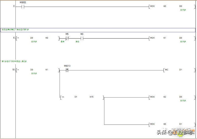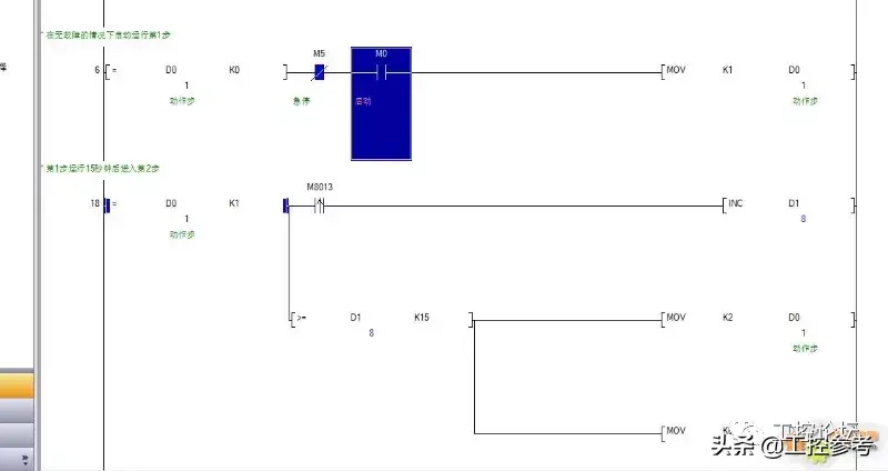 不管什么品牌的PLC,使用下面的方式来进行逻辑控制顺序控制,都是非常好的一种编程方法。既方便监控又可以随意跳转到哪一步。请改变一下我们的编程思维好么?我看那些人的所谓步进指令,还有大量的置位复位指令,非常不好阅读,也不好检查和更改。下面贴出利用三菱软件的编程图,其它品牌都一样可以采用(西门子更是如此)。