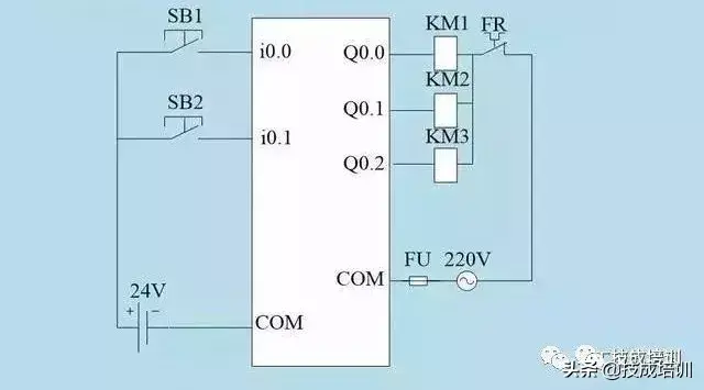 PLC的输入信号:启动按钮SB1,停止按钮SB2,热继电器常开触点FR。