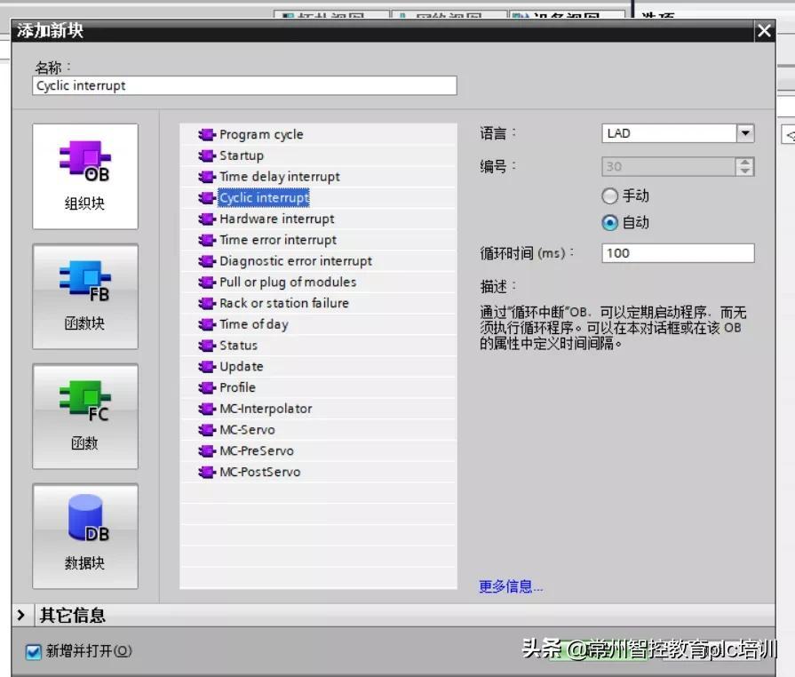 首先在项目中,如图先添加循环中断模块,循环时间为0.1S,PID指令需要在这个模块中运行;循环中断可按一定周期产生中断,执行其中的程序 。