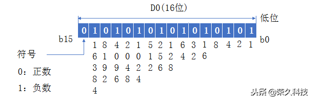 数据寄存器是用来存放数据的软元件,其表示符号位D,按十进制编号。一个数据寄存器可以存放16位二进制数,器最高位(符号位为0:正数;符号位为1:负数),一个数据寄存器可以存放-32768~+32767范围的数据。16位数据寄存器的结构如下: