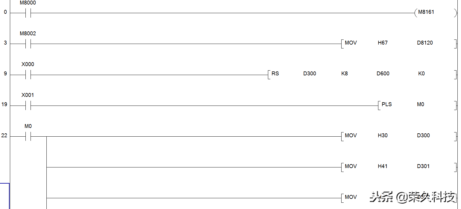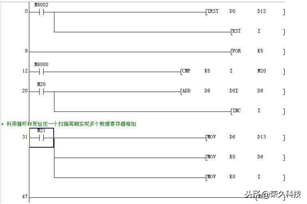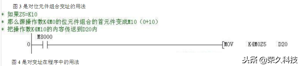 三菱FX系列PLC有 V0~V7 和 Z0~Z7 共十六个变址寄存器,它们都是16位寄存器,变址寄存器V、Z实际上是一种特殊用途的寄存器,其作用是改变元件的编号(变址),例如V0=5,若执行D20V0,则实际被执行的元件为D25,(D20+5)。变址寄存器可以像其他数据寄存器一样读写,需要进行32位读写时,可将V、Z串联使用(Z为低位,V为高位)。
