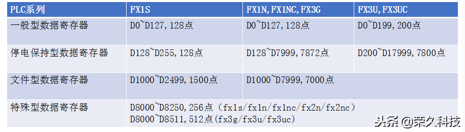 三菱FX系列PLC的数据寄存器可分为一般型、停电保持型、文件型和特殊型数据寄存器。三菱FX系列PLC的数据寄存器点数如下表所示