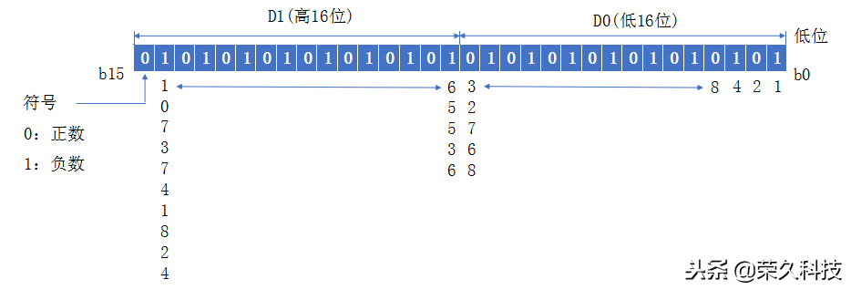 两个相邻的数据寄存器组合起来可以构成一个32位的数据寄存器,能存放32 位二进制数,其最高位为符号位(0——正数;1——负数),两个数据寄存器组合构成的32 位数据寄存器存放-2147483648~+ 2147483647范围的数据。32位数据寄存器的结构如下: