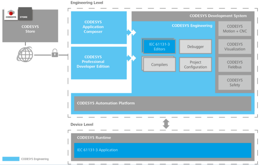 这里介绍的CODESYS主要指的是CODESYS上位开发程序,也就是下图中Engineering Level的部分。
