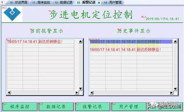 4、丝杆设有正反转限位,当触及限位时需要报警,要求设计当前报警显示和历史报警记录。