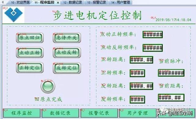 3、原点回归完成后,再按下正转定位按钮,步进电机正转运行指定距离自动停止(距离的长度由绝对定位指令的脉冲数决定)。按下反转定位按钮,步进电机反转运行指定距离自动停止。